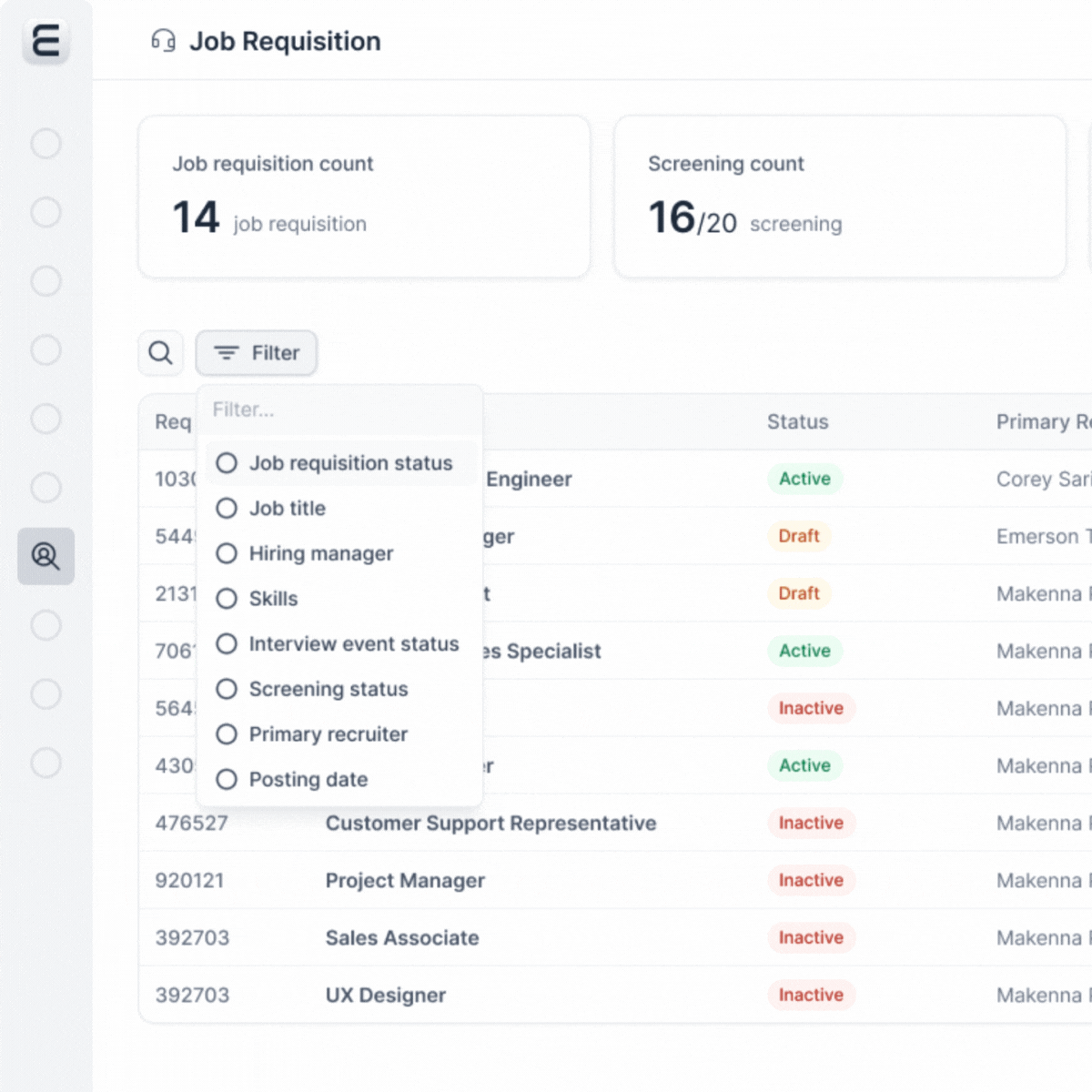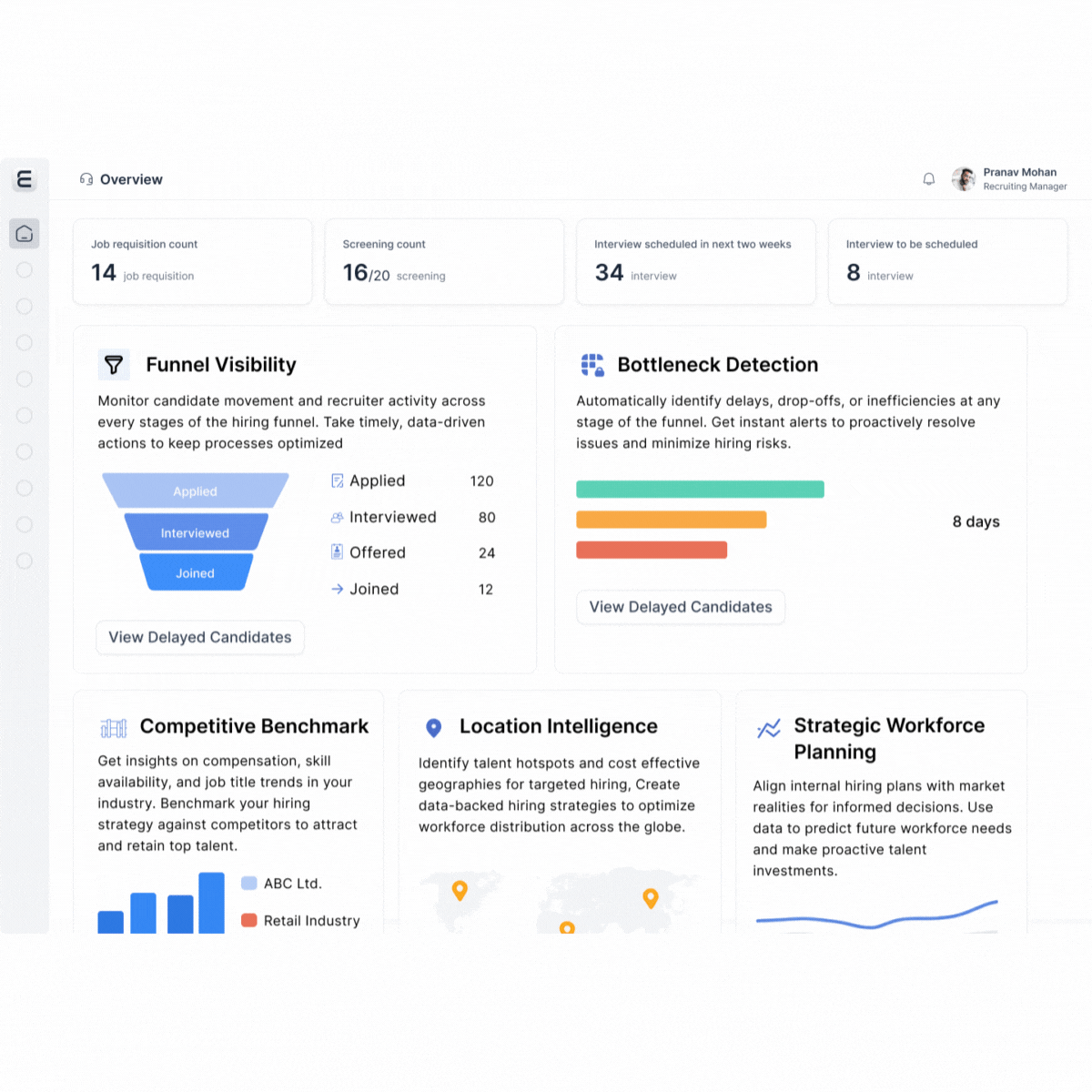 Monitor candidate movement and recruiter activity across every stage of the hiring funnel. Take timely, data-driven actions to keep the processes optimized.