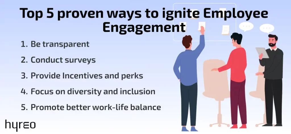 HR managers should adopt a bottom-up approach to implement engagement strategies. The best way to do this is by using employee questionnaires and surveys where employees can freely express their opinions and share their feedback.